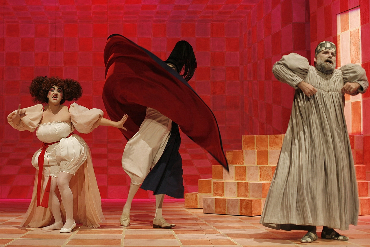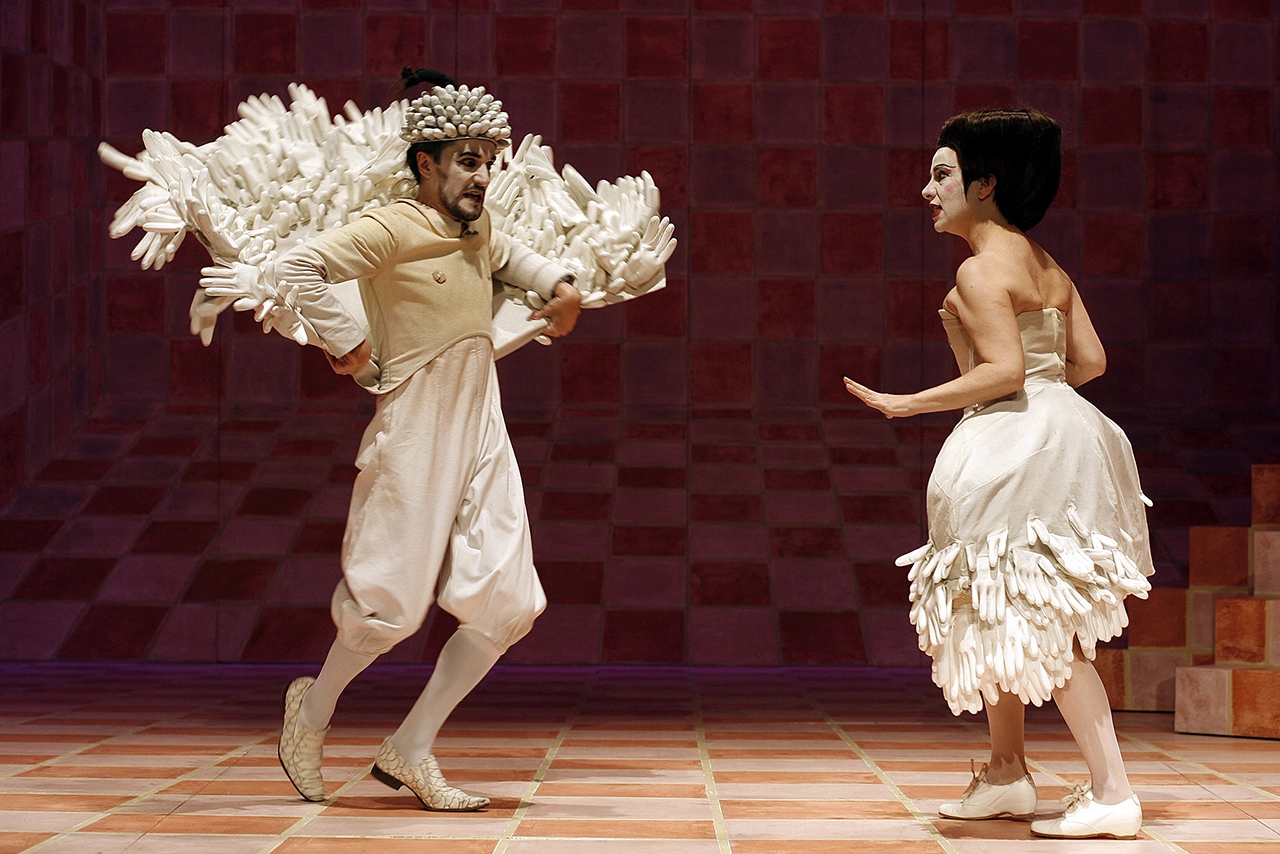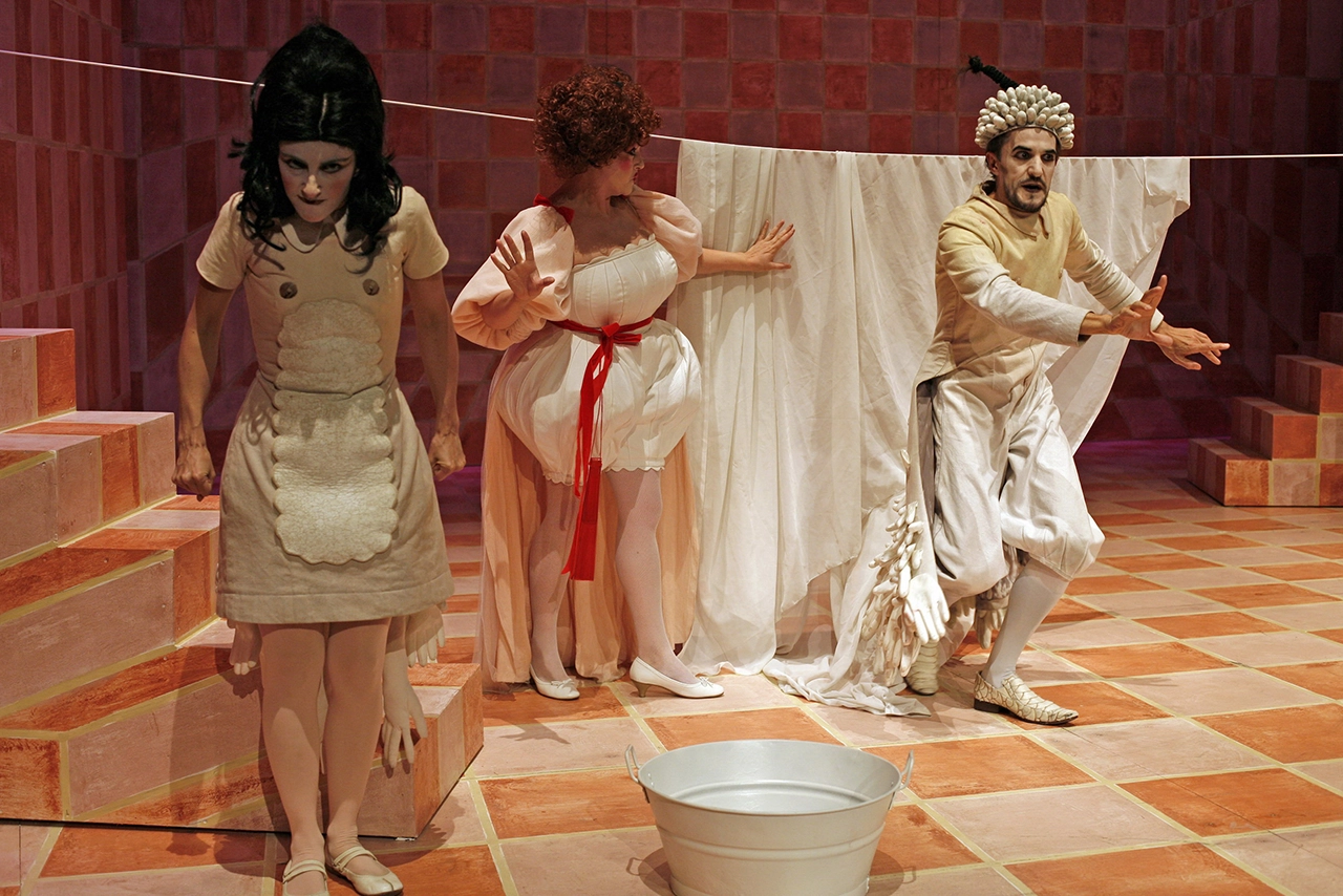 No se permite ni un leve descenso del ritmo, en todo momento acelerado, pero no precipitado, lo que impide el aburrimiento. La escenografía es más compleja de lo que parece, con ese ajedrezado que conforma un entramado de planos y perspectivas que otorgan profundidad y algo de desazón. Y el vestuario es simplemente maravilloso, tan corpóreo que habría que llamar esculturas a los trajes y pelucas para hacer justicia.